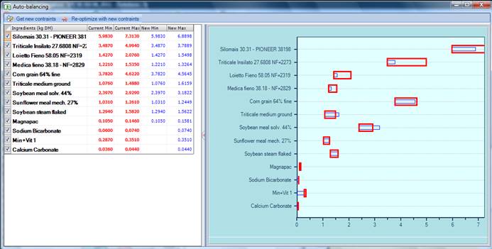 In the left part of the panel there is a list of feeds with their related constraints: the current constraints are shown in red, while the new ones are rendered in blue. In the right part of the panel a charts helps understanding how the ranges of the feeds change with the new set of constraints; you can notice that the colors of the boxes match those of the related constraints. In some cases the new constraints can match the current ones; this means that the current constraints are already suitable and do not need to be changed in order to obtain better solutions.