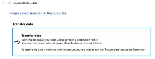The process will create a Transfer file ready to be restored from “Restore data” process, in the new computer.