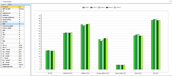 Trends analysis feature allows to examine through a bar chart the differences of nutrient and NCPS values between the versions of the recipe that you have made.