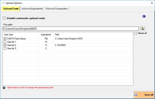 This function allows you to configure the manual upload of Ingredients (Nut_ files) and Composites (Frm_ files), and to configure the automatic export of the cost user lists files (Cst_ files), that will automatically create and update files for the cost sharing when you edit costs in NDS.